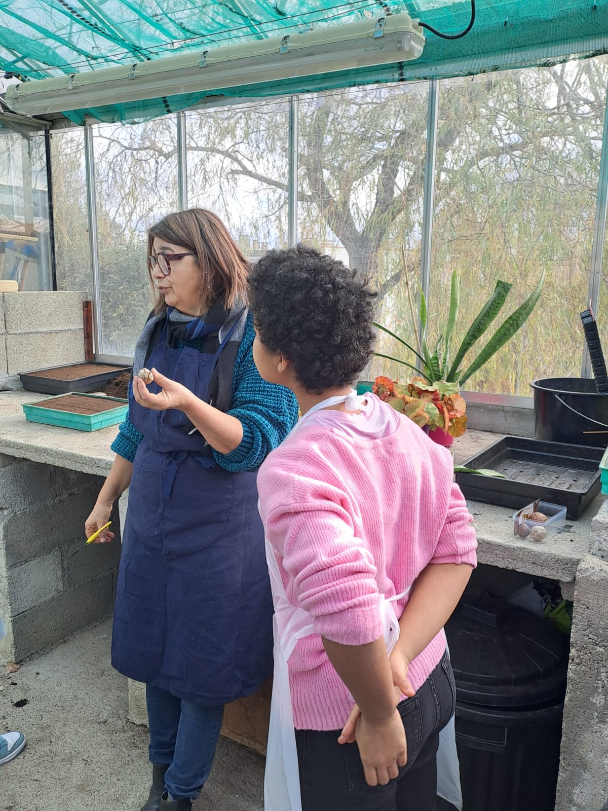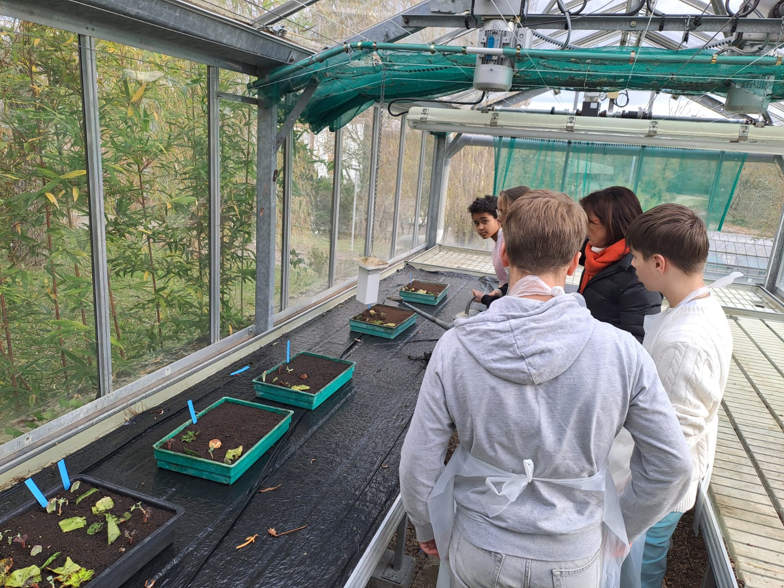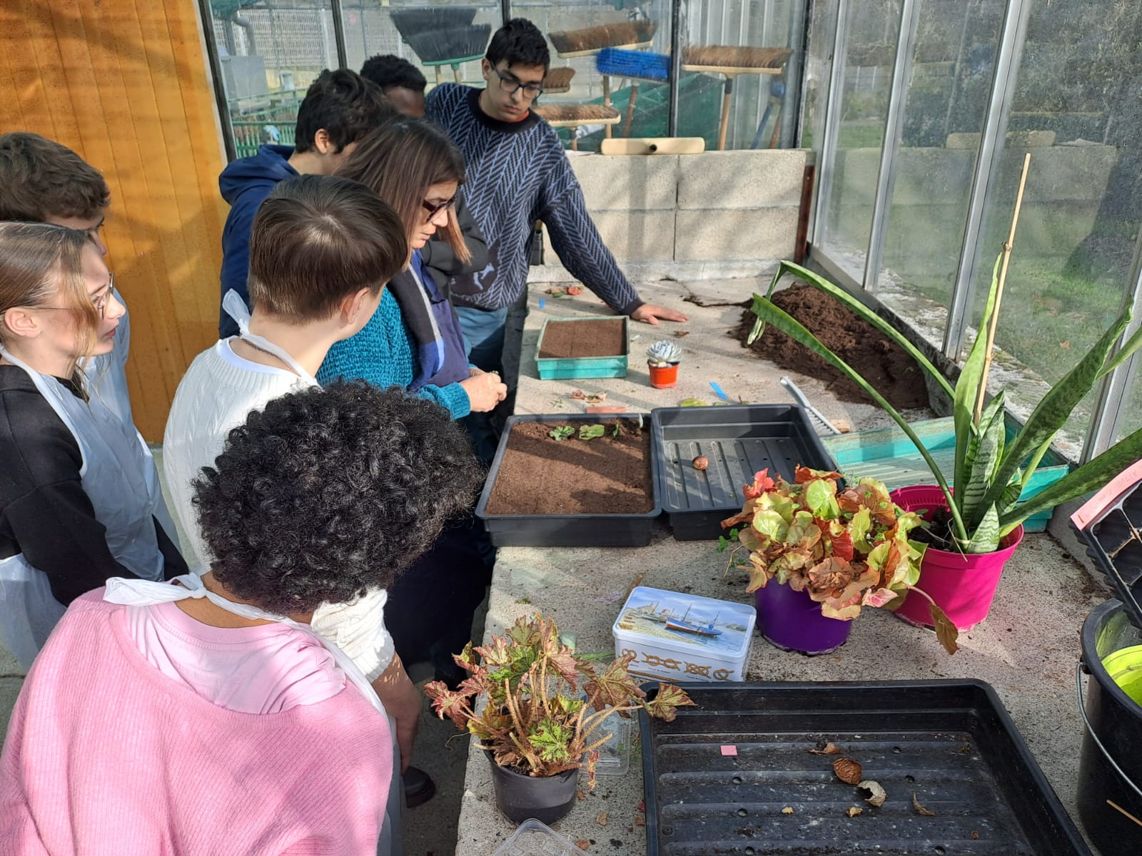 Les élèves du dispositif ULIS du collège Georges Rouquier sont venus travailler avec les élèves du CAP Métiers de l'agriculture option horticulture et production légumière qui les ont tutorés lors d'un atelier multiplication des végétaux entre autres activités.